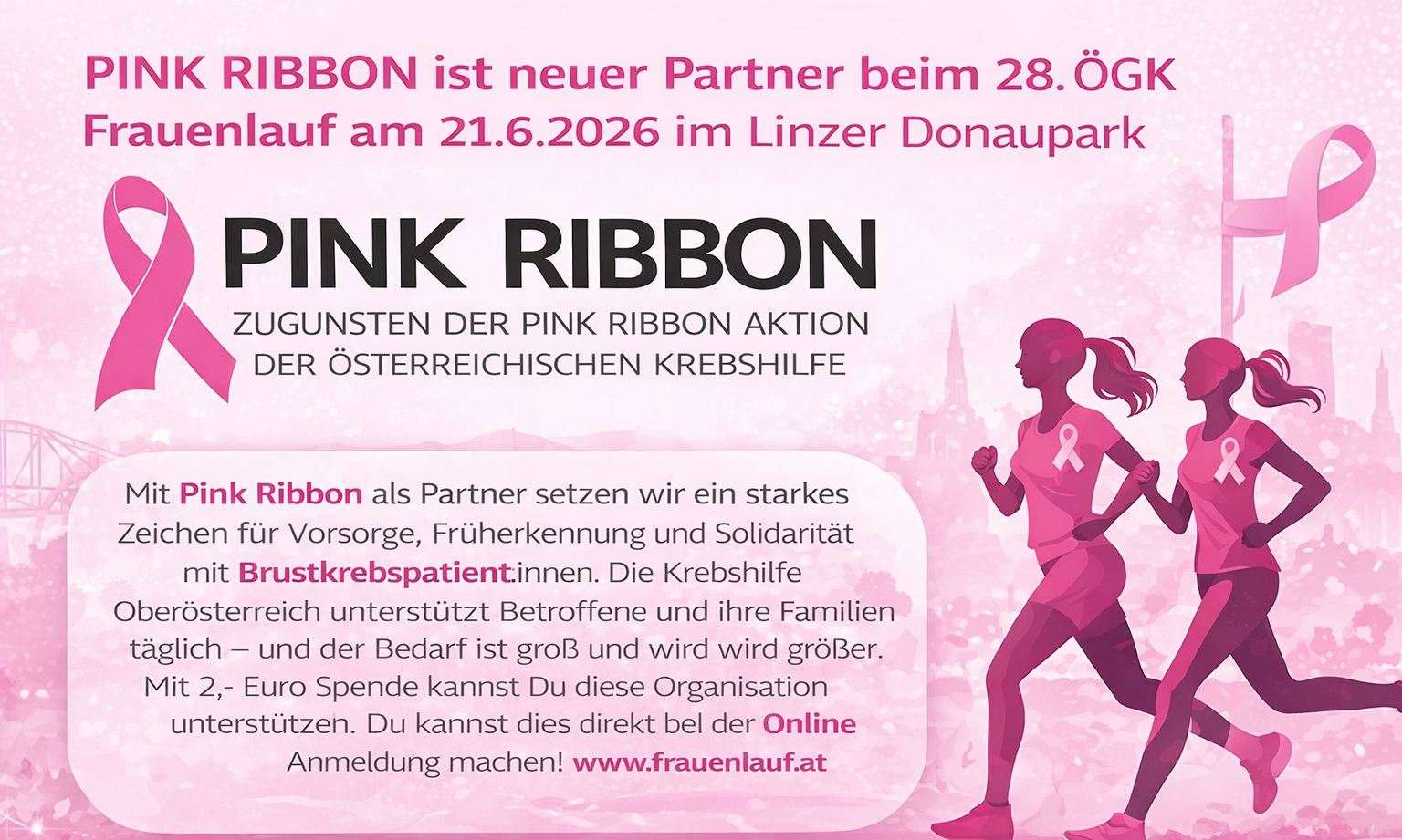 Alle Teilnehmerinnen erhalten ein Pink Ribbon als sichtbares Symbol der Unterstützung. Gemeinsam laufen. Gemeinsam helfen.